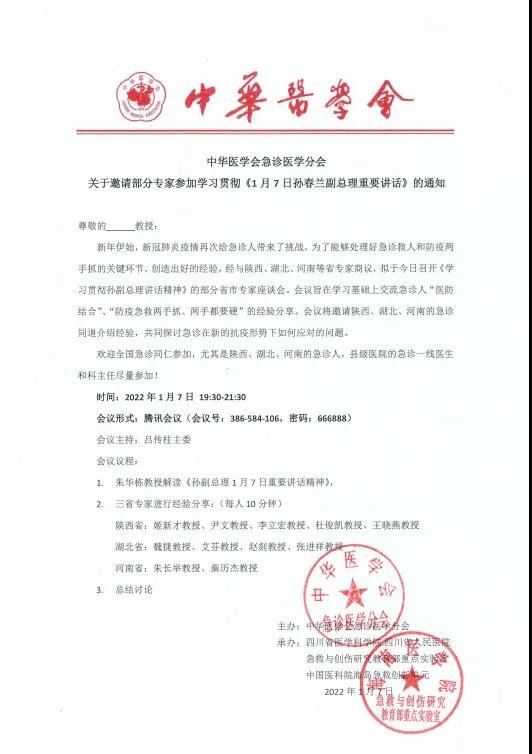 中华医学会急诊医学分会邀请部分专家参加学习贯彻《孙春兰副总理——“决不能以任何借口推诿拒收群众就医”的重要讲话精神》