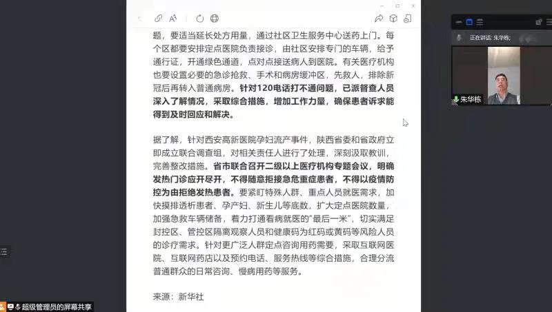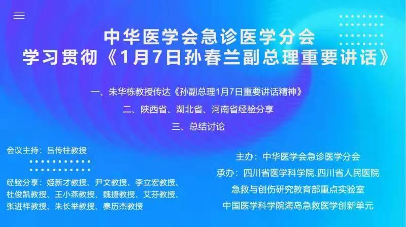 新年伊始,新冠肺炎疫情再次给急诊人带来了挑战,为了能够处理好急诊救人和防疫两手抓的关键环节,创造出好的经验,经与陕西、湖北、河南等省专家商议,于1月7日晚召开了《学习贯彻孙春兰副总理讲话精神》的部分省市专家座谈会,会议以线上的方式进行,由中华医学会急诊医学分会主任委员吕传柱教授主持,旨在学习基础上交流急诊人“医防结合”、“防疫急救两手抓、两手都要硬”的经验分享。 会议首先由北京协和医院急诊科主任、中华医学会急诊医学分会副主任委员朱华栋教授解读《孙春兰副总理重要讲话精神》,接着来自陕西省的姬新才教授、尹文教授、李立宏教授、杜俊凯教授、王小燕教授,来自湖北省的魏捷教授、艾芬教授、赵剡教授、张进祥教授,来自河南省的朱长举教授、秦历杰教授分别就抗疫经验作了精彩分享和深入探讨。 最后,由吕传柱主委作会议总结,吕主委指出:“新冠疫情下的急诊,需要不断规范和优化流程,始终坚持以服务病人为宗旨,团结一致做好以下六个方面, 一、守好门,做急诊该做的事; 二、保证自身安全,才能更好地服务于病患; 三、以病人危重程度为导向,做好预检分诊,正确评估病情; 四、做到发热门诊和急诊一体化管理,畅通就诊流程,保障患者安全; 五、积极做好自身心理干预,正确面对新冠疫情; 六、尽快更新相关指南和共识,让急诊医务人员在疫情下开展工作有章可循,尤其是基层医院的一线工作人员。